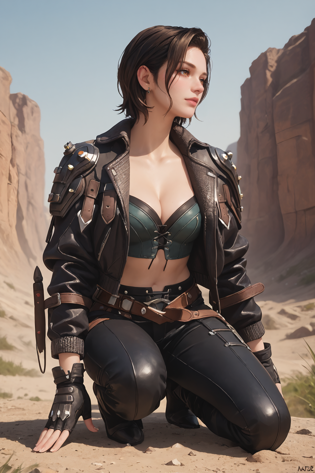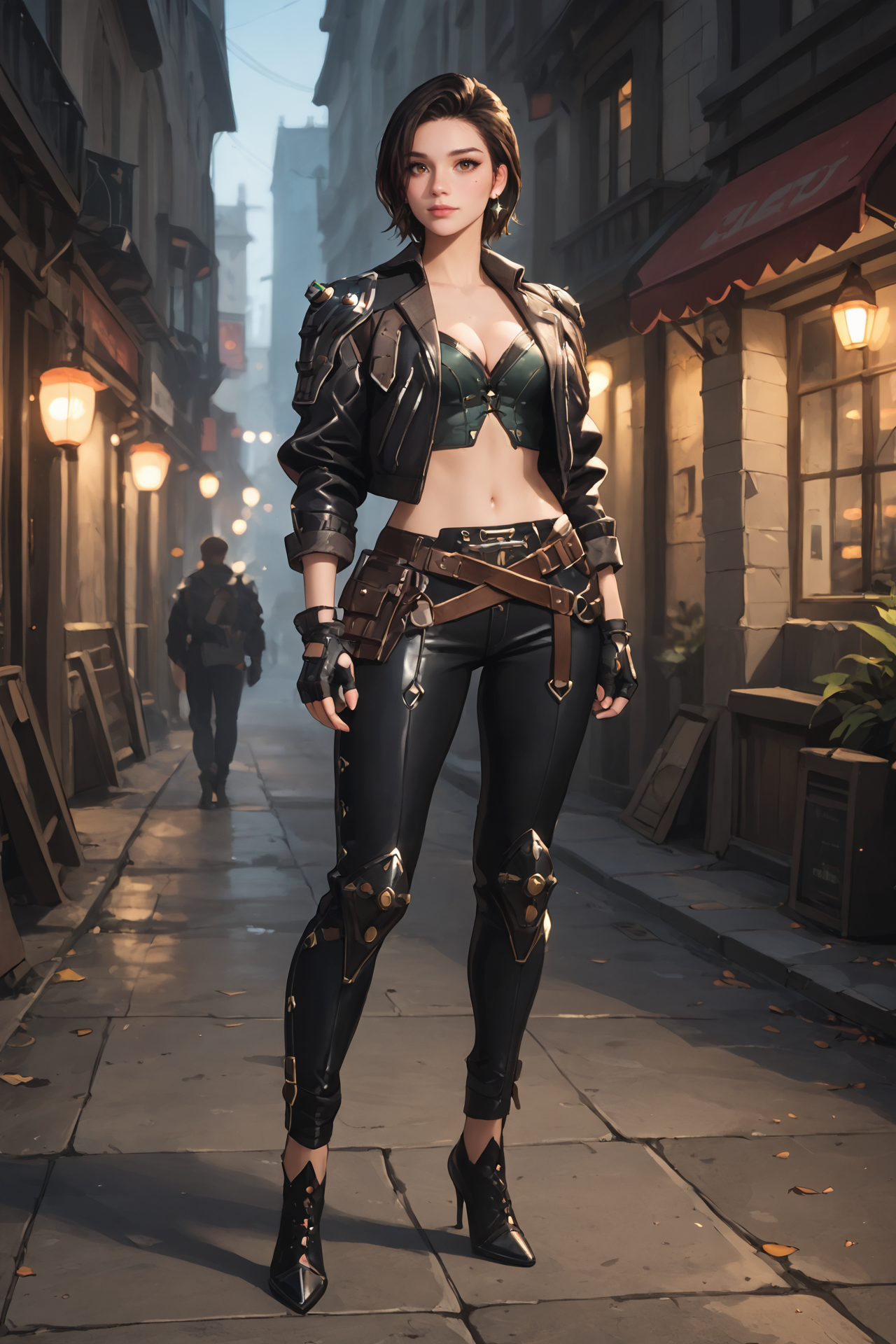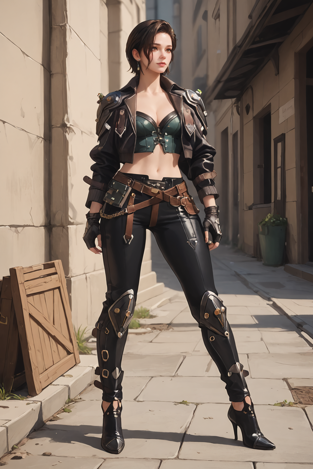 shoulder armor,cleavage,black gloves,fingerless gloves,black jacket,medium breasts,midriff,