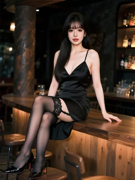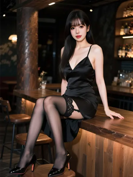 一位年轻的亚裔女性坐在一间光线昏暗的现代室内空间的木地板上,空间内有木质立柱和沙发。她拥有精致的椭圆形脸庞,五官细腻,大而杏仁状的眼睛,小巧笔直的鼻子,以及薄而自然粉红的嘴唇。她的头发是长而直的黑色发丝,顺滑地垂落在肩膀和背部,无任何卷曲或造型。她身材苗条匀称,腰肢纤细,臀部圆润紧实,双腿修长匀称,小腿线条平滑。她身着一套黑色蕾丝内衣,包括一件透明黑色蕾丝胸罩,显露其饱满紧实的C罩杯胸部,呈现深邃乳沟;配套的黑色蕾丝丁字裤紧贴身体,突出私密部位的轮廓,阴部区域被薄纱覆盖,展现出平滑无毛的肌肤质感。她的双腿穿着黑色丝袜,由光滑半透明材质制成,从大腿顶部延伸至脚踝,由一条黑色蕾丝吊袜带固定。她脚穿黑色高跟鞋,细跟长约10厘米,鞋面装饰有金色链条,露出脚趾,凸显优美的足弓。她的皮肤白皙、光滑,如瓷器般无瑕疵。双手被黑色皮质手铐反绑于身前,手铐连接一条细链,链的末端固定在地板上;双脚同样被黑色皮质脚踝铐束缚,配有金色链条,限制其活动。地板上散落着数件黑色皮具道具,包括鞭子和绳索。整体色调以黑色和暖木色为主,顶部柔和的光线突出她身体的曲线与服饰的细节。