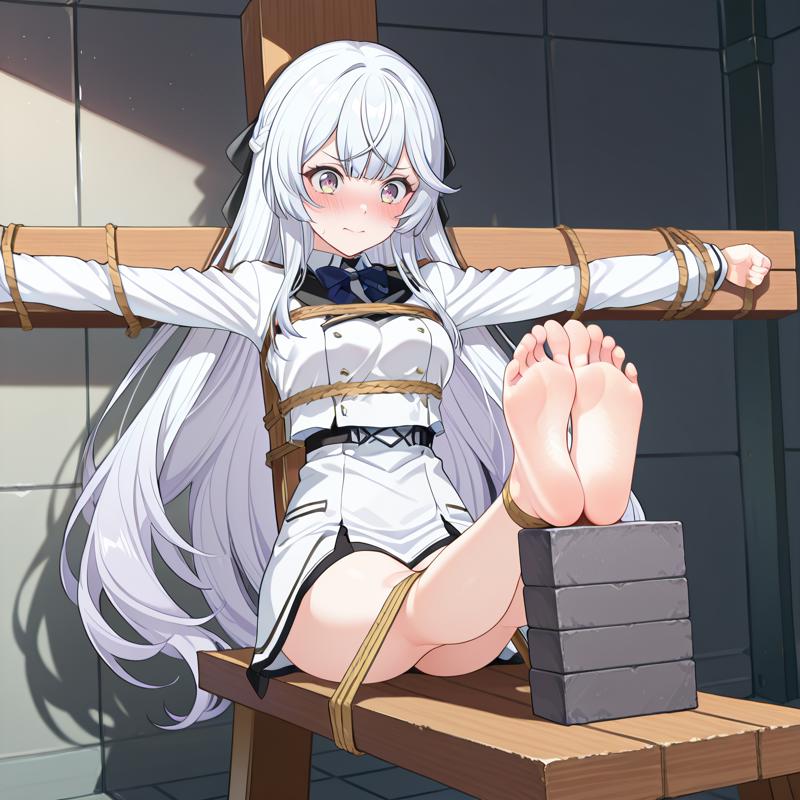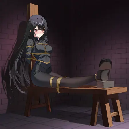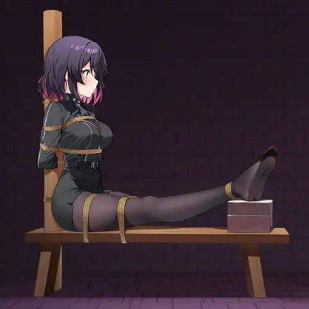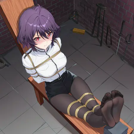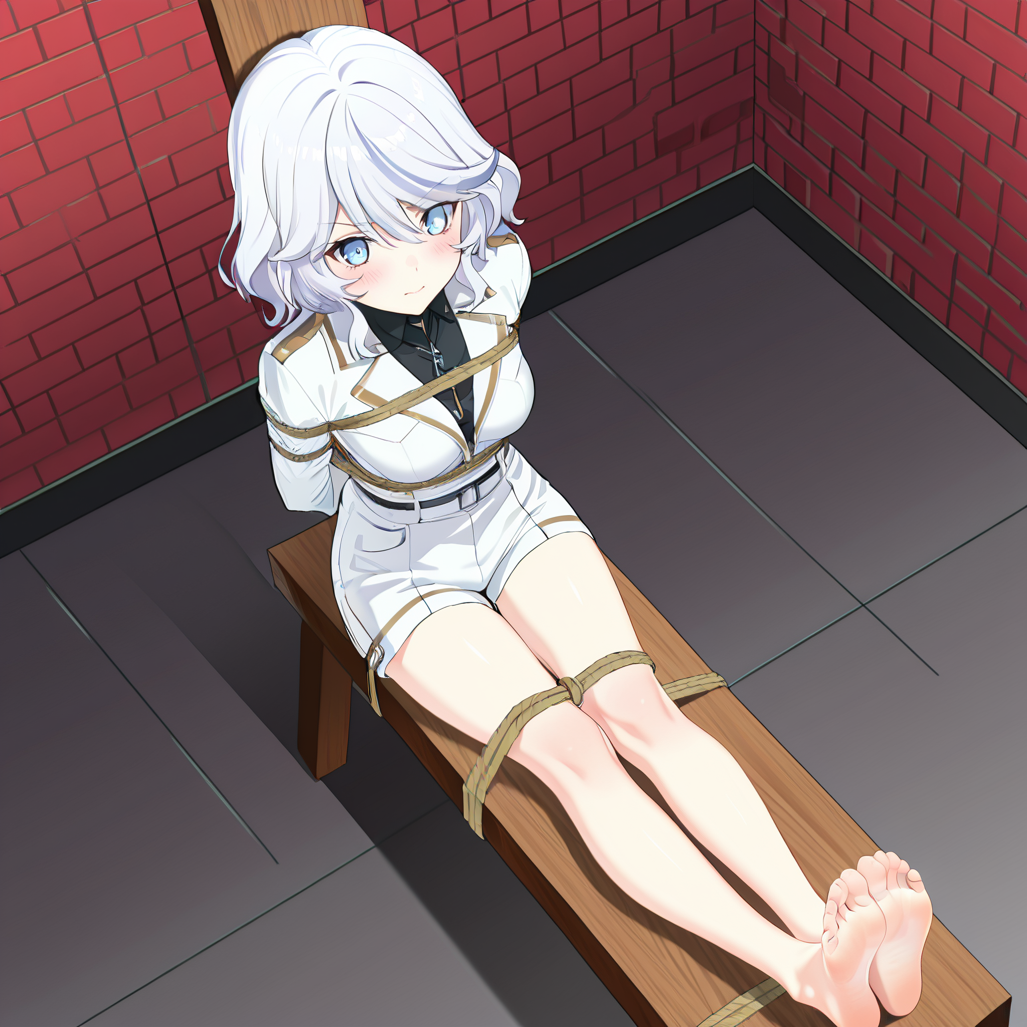Tigerbench, bound, rope, sole focus, 1girl, spread arms, bound arms, sitting