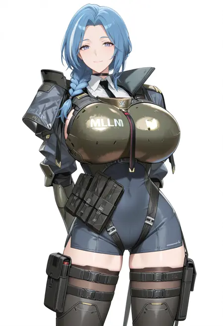 Base skin:helen_orig, blue hair, bulletproof vest, braid, bodysuit, ammunition pouch, multiple belts,