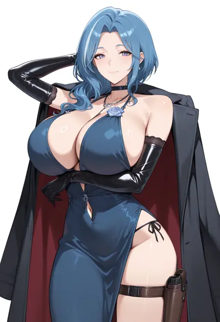 Skin: helen_skin, blue dress, hair over shoulder, navel cutout, holster,bare shoulders