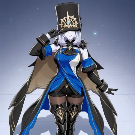 DecSha_IL, 1girl, solo, mature female, grey hair, colored skin, white skin, hat, covered eyes, coat, dress, fur trim, black gloves, cape, pantyhose, thigh boots