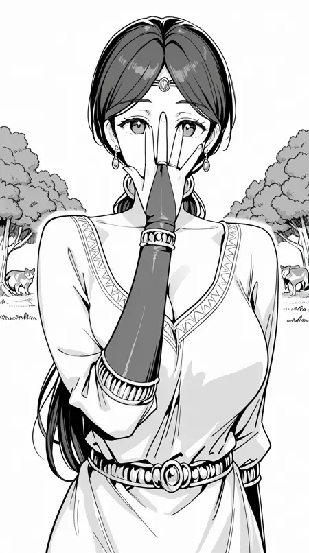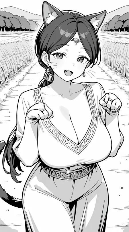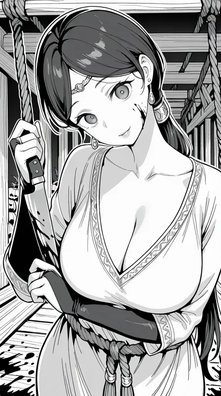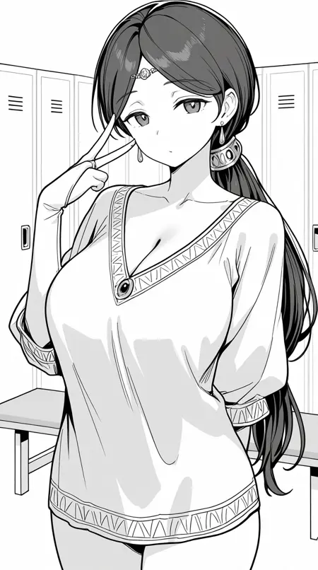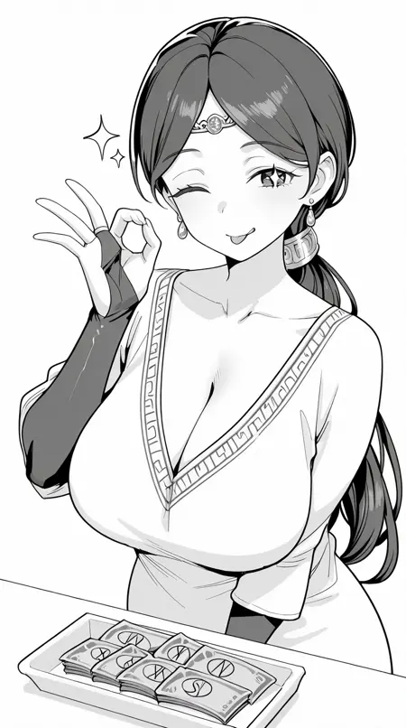 rince mother, monochrome, greyscale, long hair, ponytail, parted bangs, low-tied ponytail, mature female, large breasts