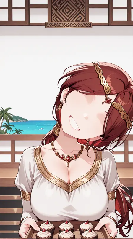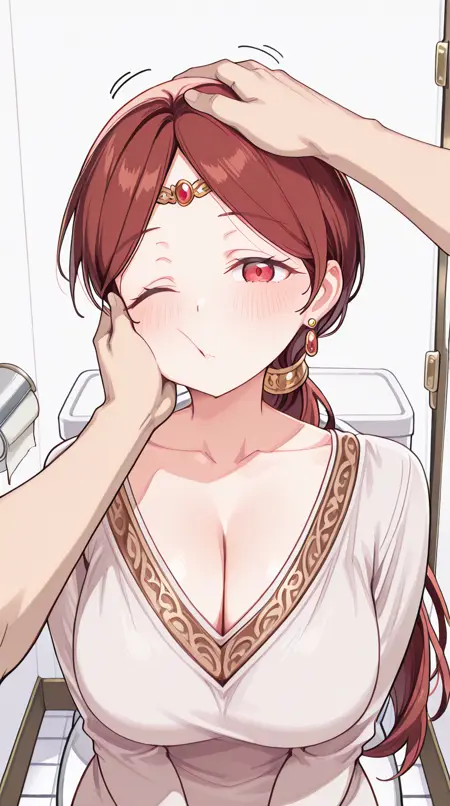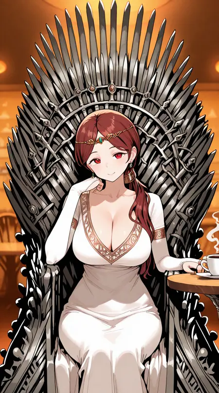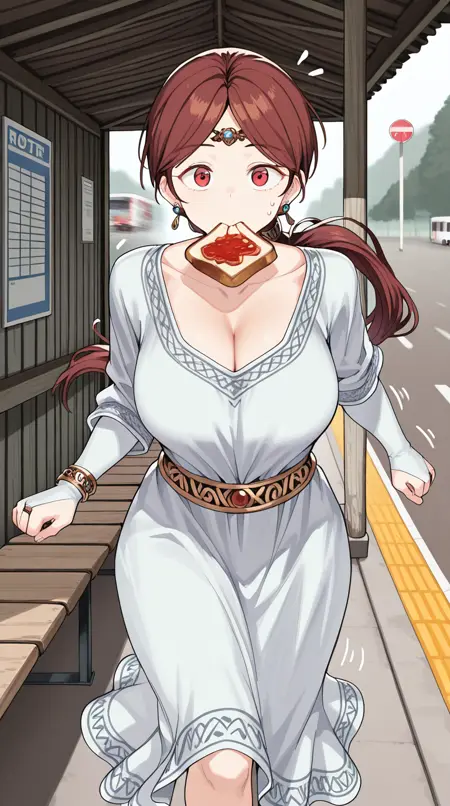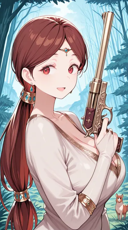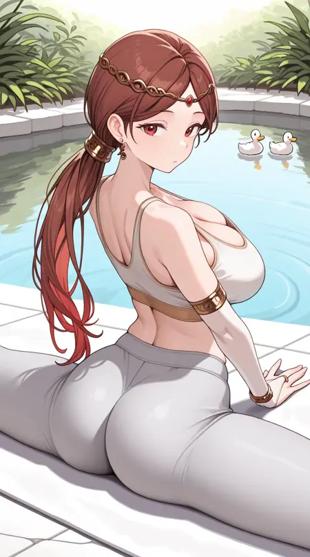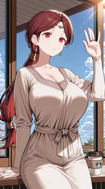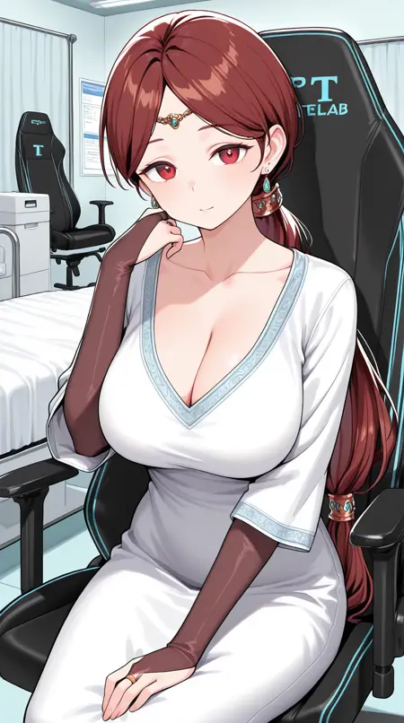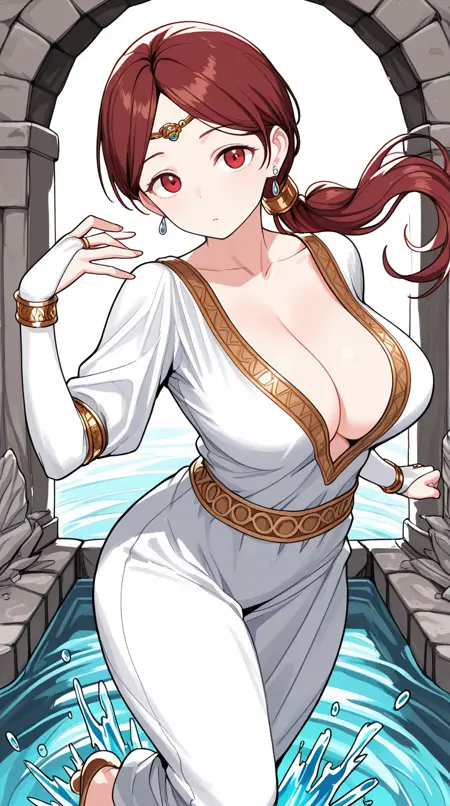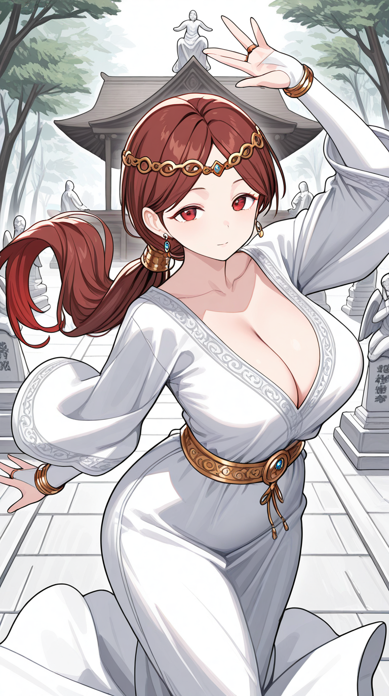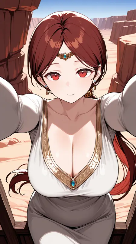 rince mother, long hair, brown hair, red eyes, ponytail, red hair, parted bangs, low-tied ponytail, mature female, large breasts