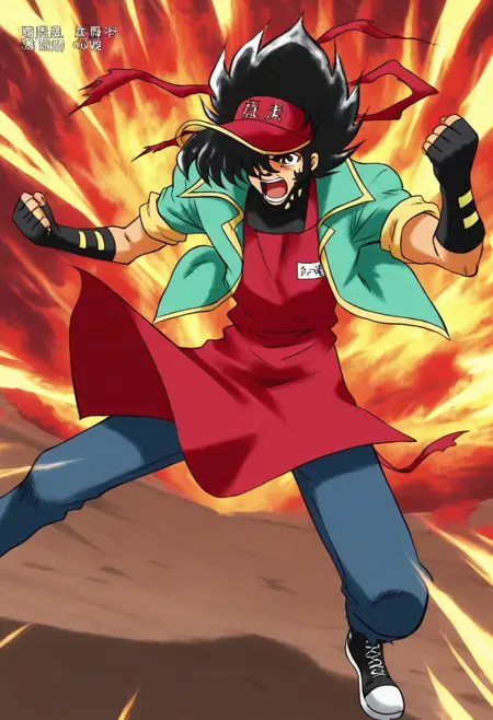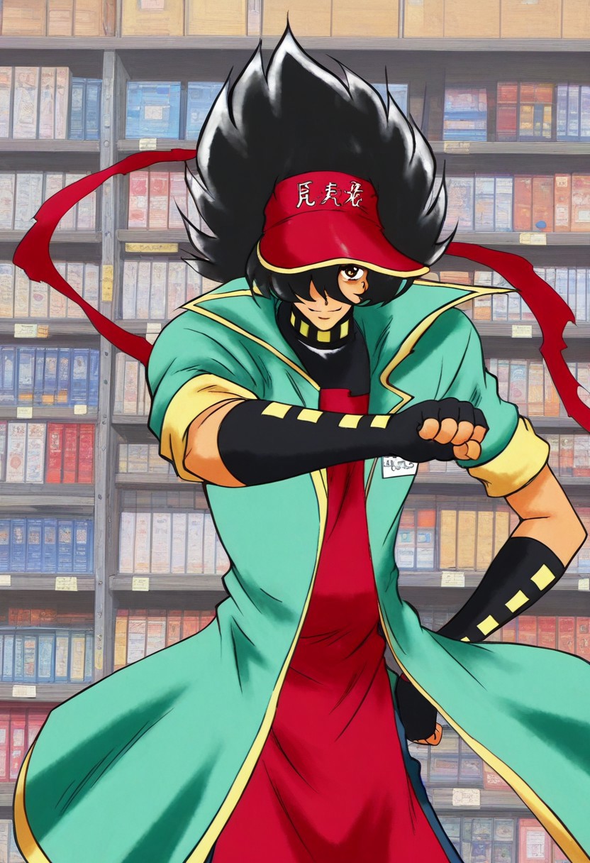 | トレーニングワード | Meito Anizawa, black hair, red visor cap with Japanese letters, long red head bandana, brown eyes, bangs covering one eye, long green open jacket, popped collar, rolled sleeves, black turtleneck undershirt, red apron, employee name tag, black fingerless arm gloves, yellow accents, blue pants, black sneakersコピーしました! |