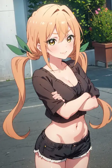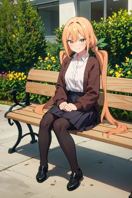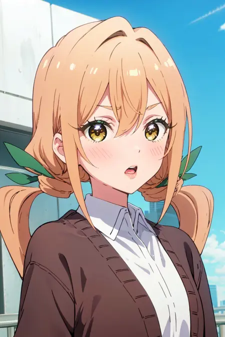 要还原她的原装造型,请使用以下标签:pikkykarane, 1girl, solo, looking at viewer, blonde hair, orange hair, long hair, bangs, twintails, hair between eyes, low twintails, very long hair, yellow eyes, breasts, medium breasts, green ribbon, hair ribbon, shirt, white shirt, collared shirt, ribbon, cardigan, low ponytail