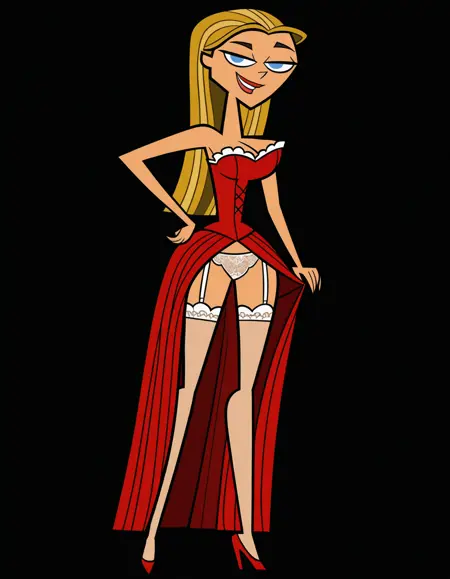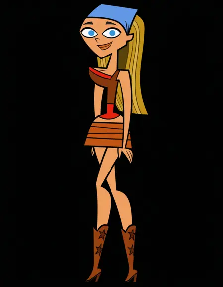 衣装: バンダナ、クロップトップ、重ね着シャツ、ミニスカート、ハイヒールブーツ、カウボーイブーツ
