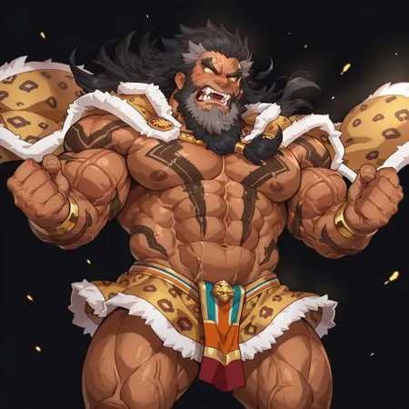孟獲、黒髪、長い髪、ふわふわした髪、とがった髪、ツートーンの髪、ひげ、長いひげ、ツートーンのひげ、タトゥー、全身タトゥー、金色の目、濃い眉、巨大な筋肉、血管、レオパード模様のマント、レオパード模様のスカート
