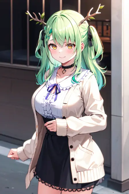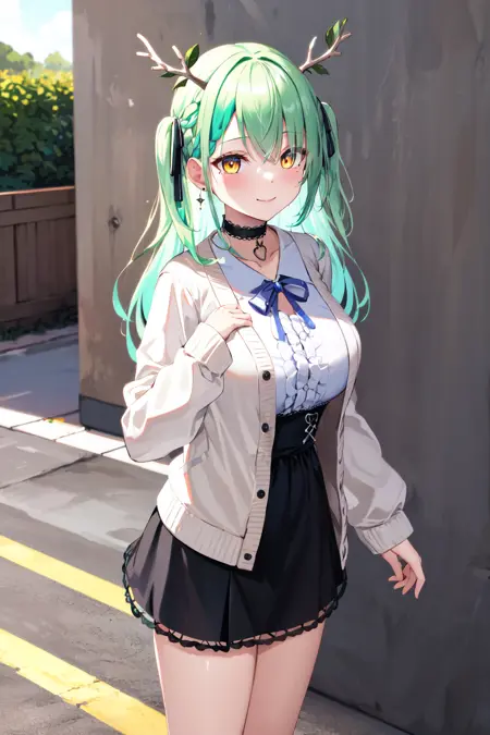 hmcf, long hair, antlers, branch, two side up, hair ribbon, braid, yellow eyes, large breasts, jewelry, black choker, frills, white shirt, long sleeves, white cardigan, open cardigan, suspender skirt, black skirt, white socks