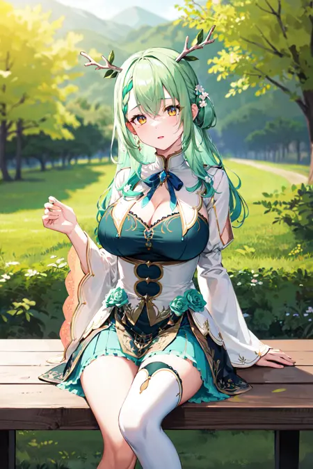 hmcf, long hair, antlers, branch, braided bangs, hair flower, yellow eyes, large breasts, jewelry, dress, cleavage, wide sleeves, green flower, single thighhigh, white thighhighs