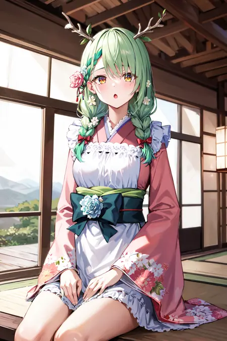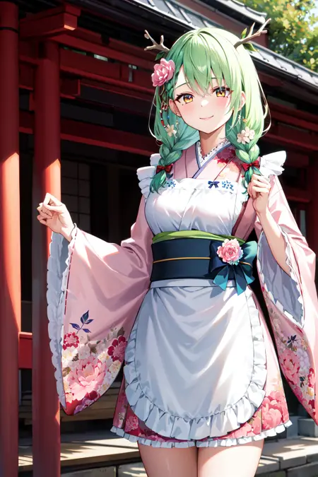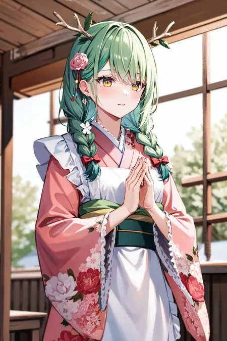 hmcf, long hair, antlers, branch, low twin braids, hair flower, yellow eyes, floral print, japanese clothes, pink kimono, wide sleeves, frilled apron, white apron, bow, sash, obi, pink flower