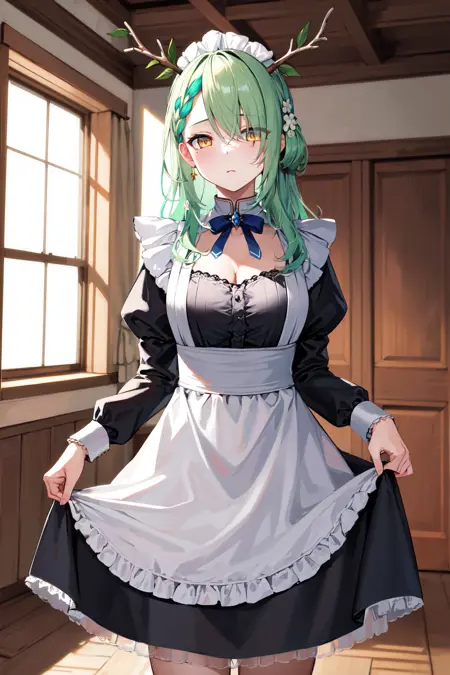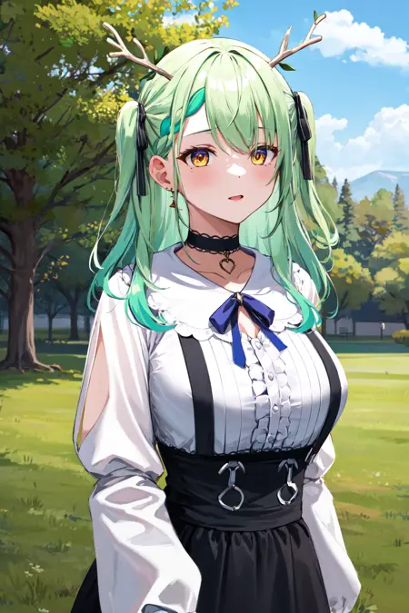 hmcf, long hair, antlers, branch, two side up, hair ribbon, braid, yellow eyes, large breasts, jewelry, black choker, frills, white shirt, long sleeves, suspender skirt, black skirt, white socks