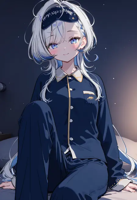 青い目、バーチャルYouTuber、青い髪、前髪、長い髪、複数色の髪、編み込み、白い髪、シャツ、長袖、パジャマ、アイマスク、ズボン、