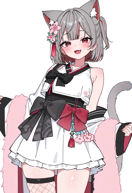iom_b、グレーの髪、動物の耳、赤い目、ピンクの花、犬歯、猫の耳、尾、髪の花、髪飾り、動物の耳のふわふわ、多色の髪、ストライプの髪、バーチャルユーチューバー、猫の尾、和服、フィッシュネット、白い着物、前髪、着物、黒いリボン、ノースリーブ、猫娘、肌の犬歯、赤い髪、肩出し、スカート、片方のタイツ、オフショルダー、タイツ、短い髪、片側アップ、腕出し、