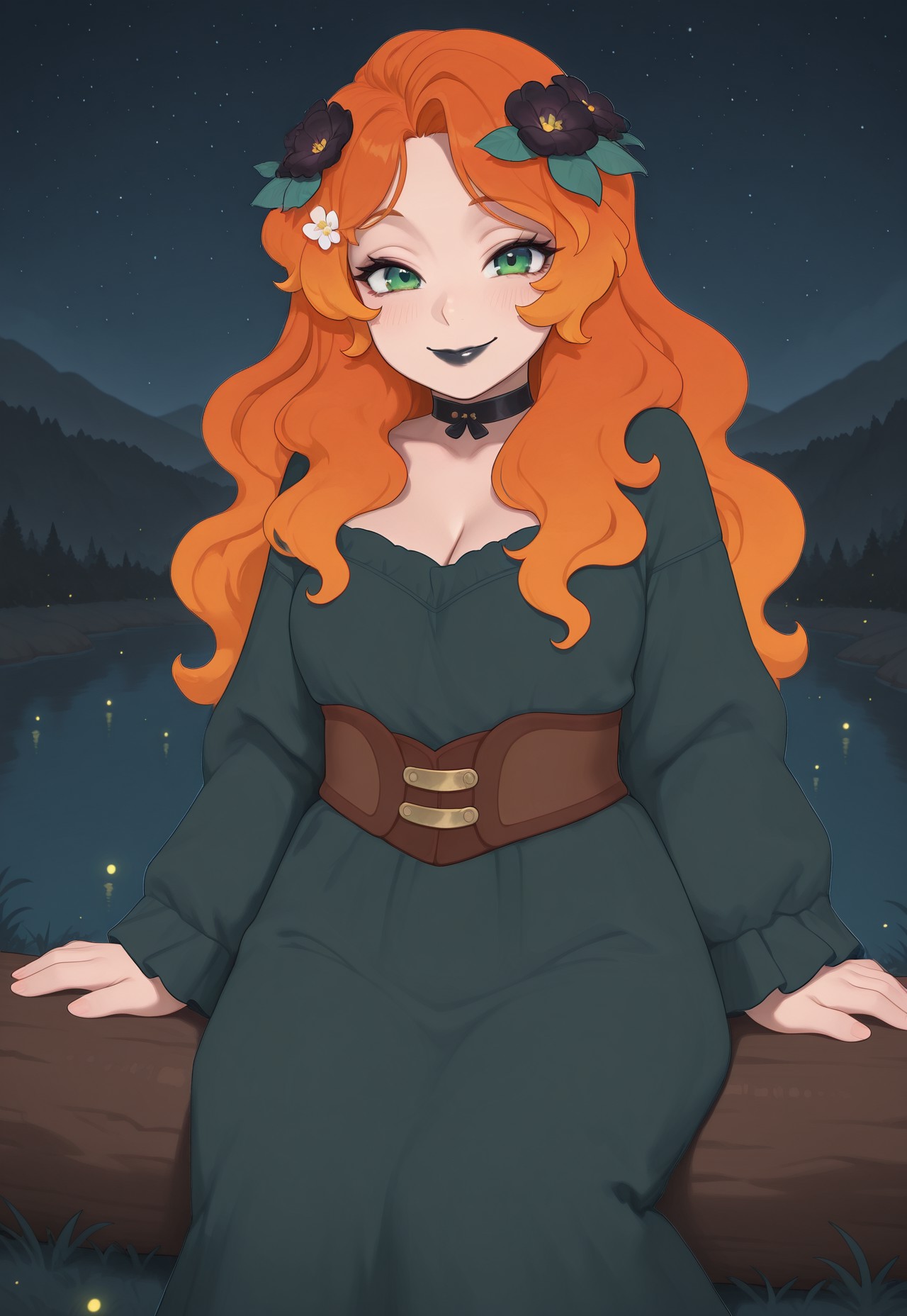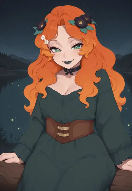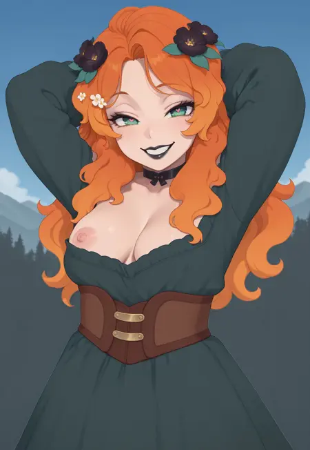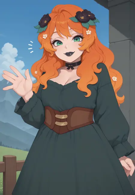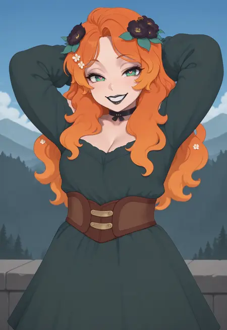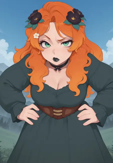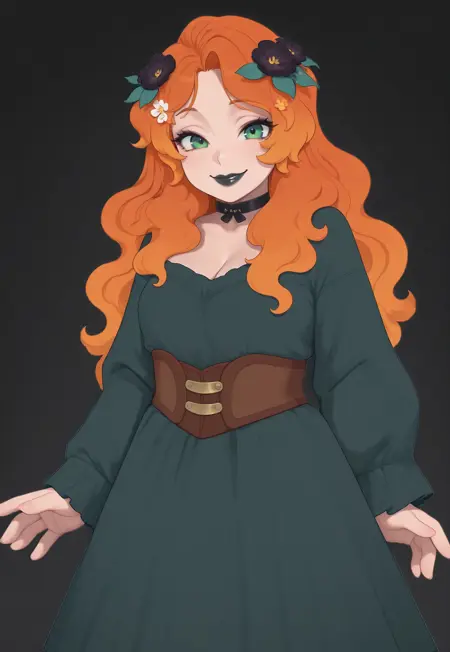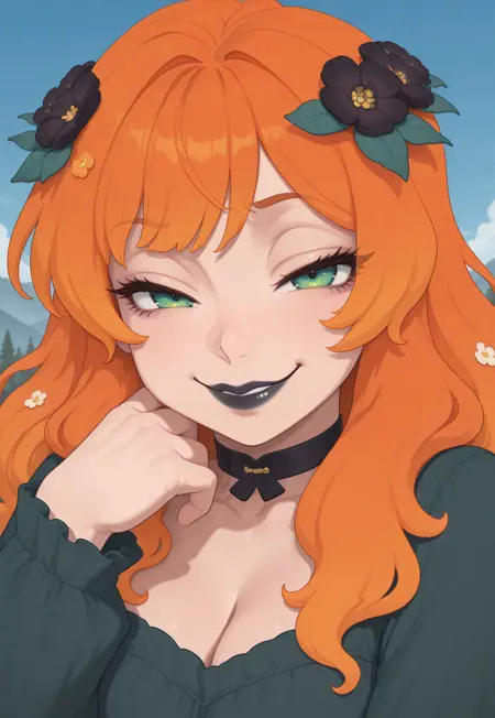 long hair, orange hair, multicolored hair, flowers in hair, flower hair ornament, green eyes, black lipstick,