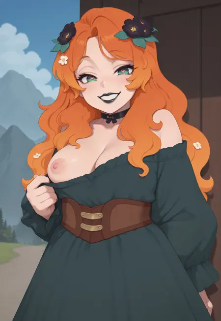 dark teal dress, black choker, long sleeves, loose sleeves, brown corset, cleavage,