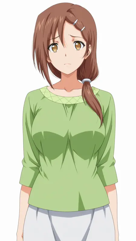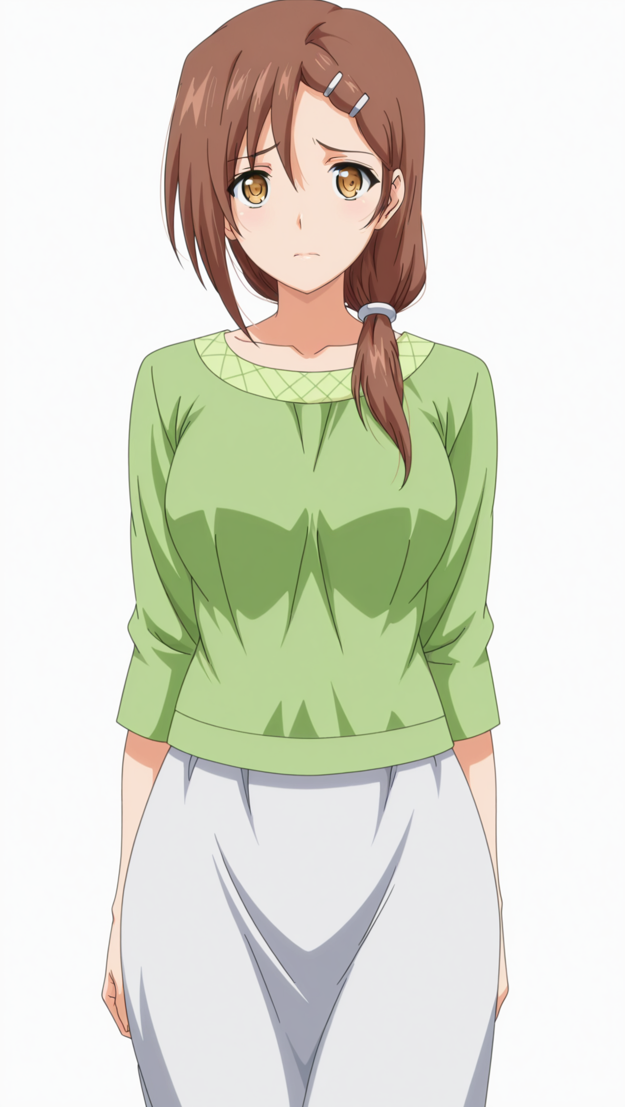((动漫着色)), 杰作,最佳画质,惊人画质,Shiori,1个女孩,低扎长发,棕色头发,黄色眼睛,中等胸部,发夹,衬衫,绿色衬衫,裙子,白色裙子,单人,姿势,站立,看向观众,正面视角,((((白色背景,简约背景))))