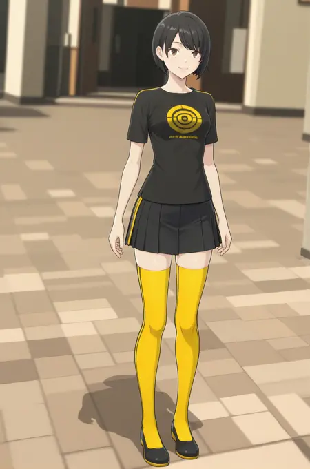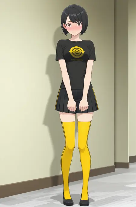 黄色上衣 印花衬衫 黑色短裙 黄色长筒袜 黑色平底鞋 头戴护目镜 黑色手套