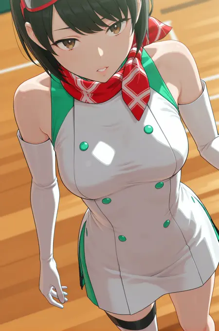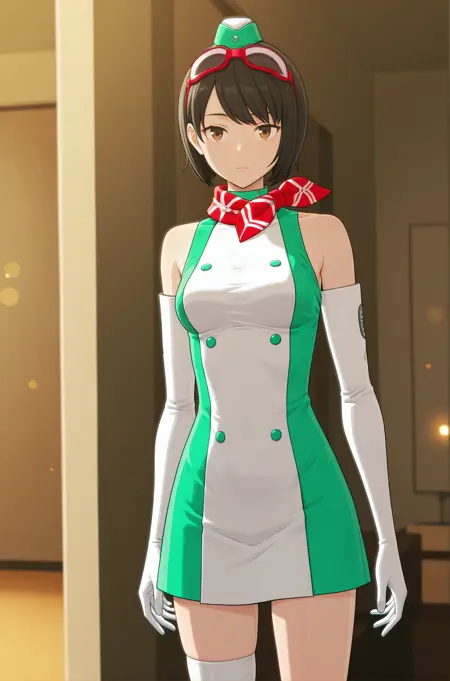 绿色连衣裙 白色连衣裙 双色连衣裙 无袖 红色围巾 头戴红色护目镜 单一白色长筒袜 绿色军帽 白色肘套 绿色高跟鞋