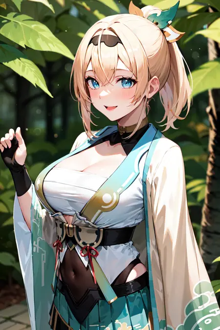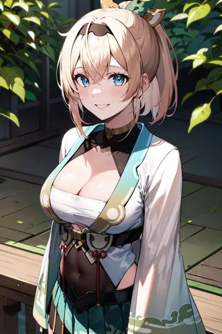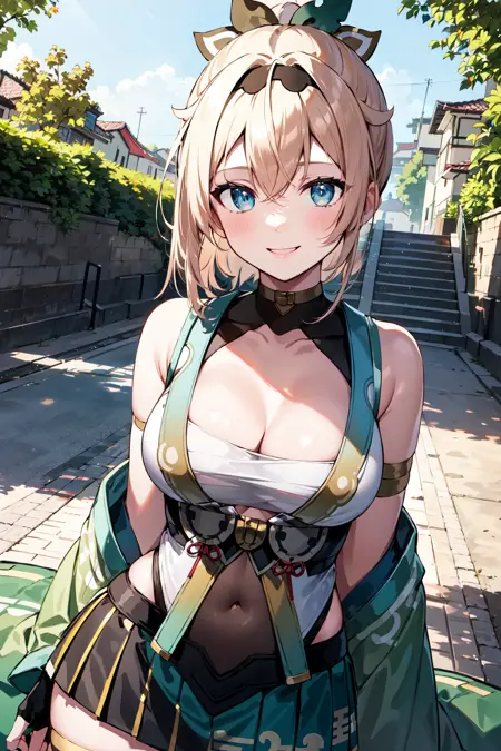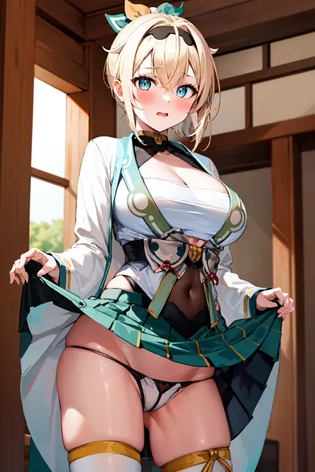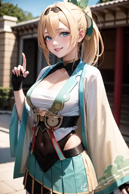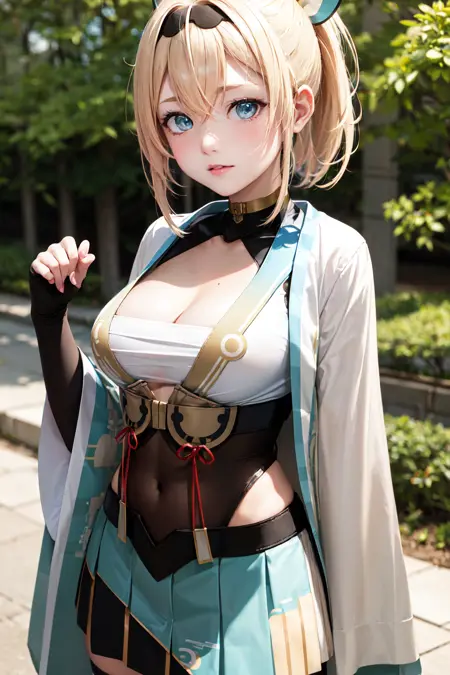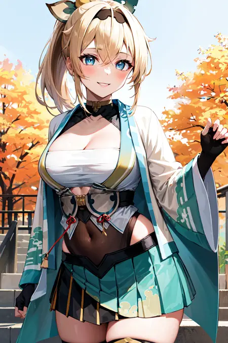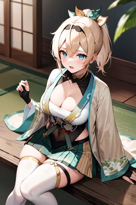 outfit1aairoha, blonde hair, ponytail, hair ribbon, black hairband, aqua eyes, medium breasts, cleavage, chest sarashi, white haori, wide sleeves, fingerless gloves, black gloves, covered navel, green skirt, pleated skirt, white thighhighs