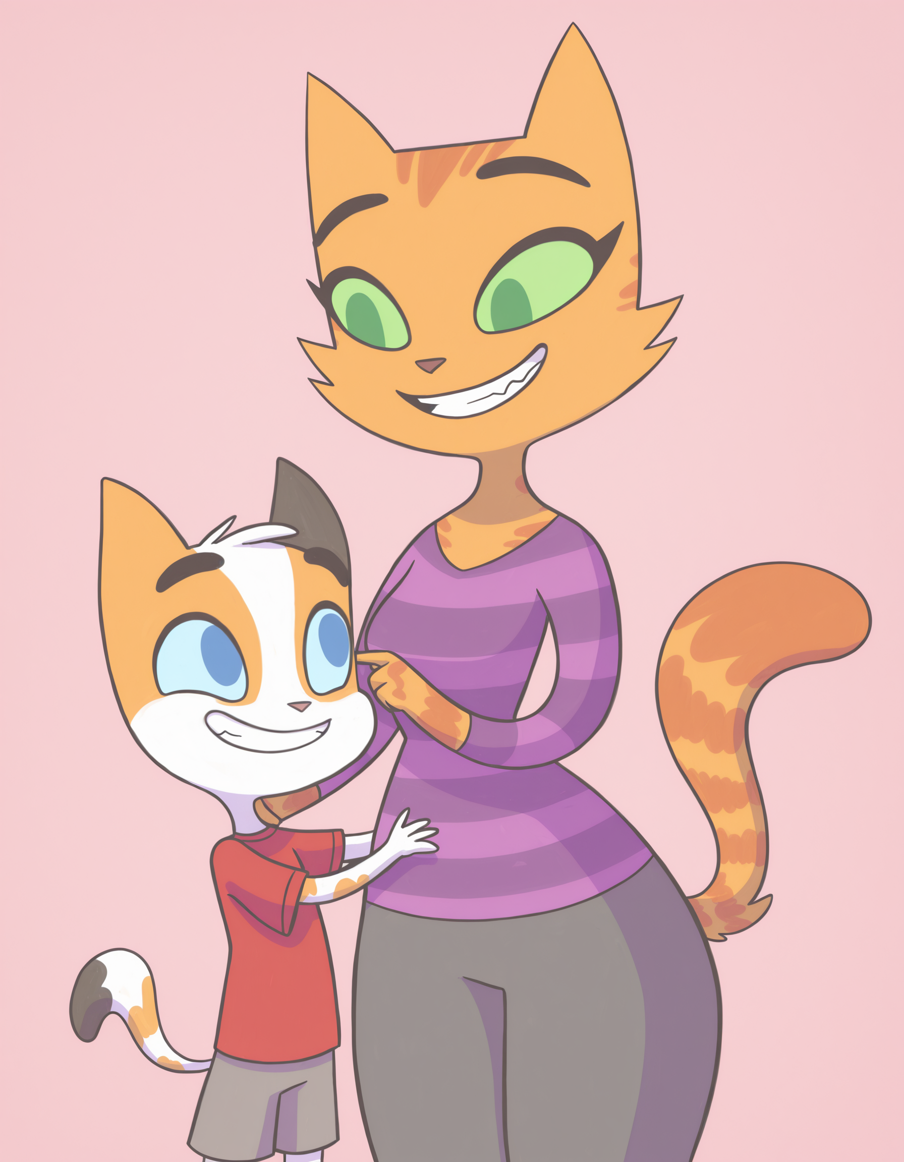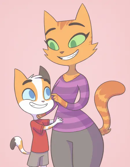 最后,我尚未对此进行广泛测试(仅测试过Vincent),但理论上你可以通过结合e621标签与描述性标签,将其他家庭成员也融入同一图像中:例如Joel可用“black fur, white fur, two-tone fur, yellow eyes, white shirt, red sleeves”;Vincent可用“calico (pattern), blue eyes, red shirt, young”;Cooper可用“black fur, white fur, countershade face, blue onesie, toddler”。