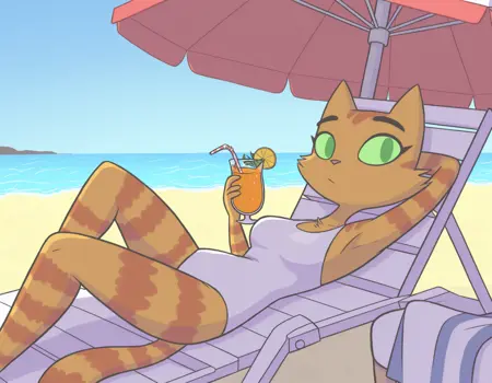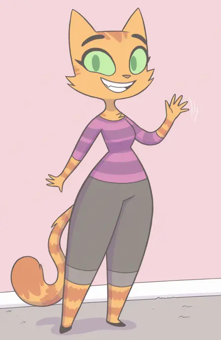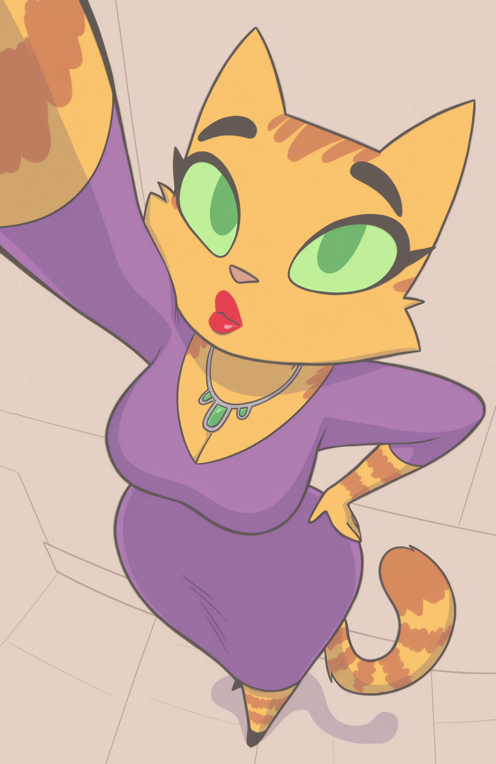 强化标签(可选):1girl, furry female, feline, green eyes, orange fur, striped tail