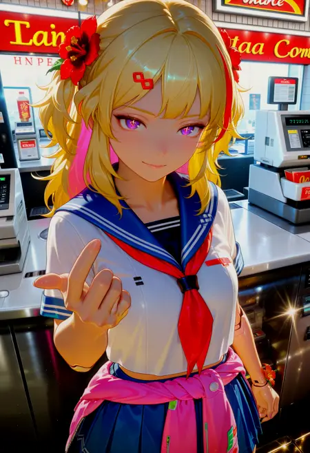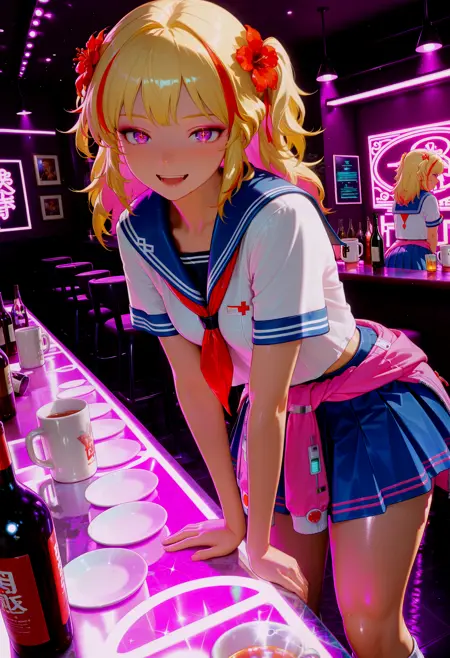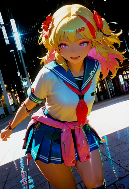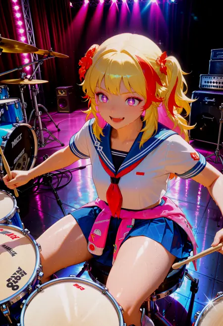 1girl, robot joints, purple eyes, blonde hair, two side up, multicolored hair, pink colored inner hair, red streak, long hair, hair flower, hair ornament, small breasts, (thick thighs:1.15),