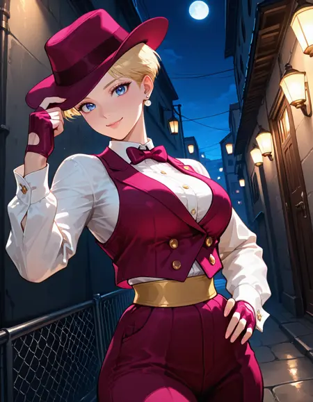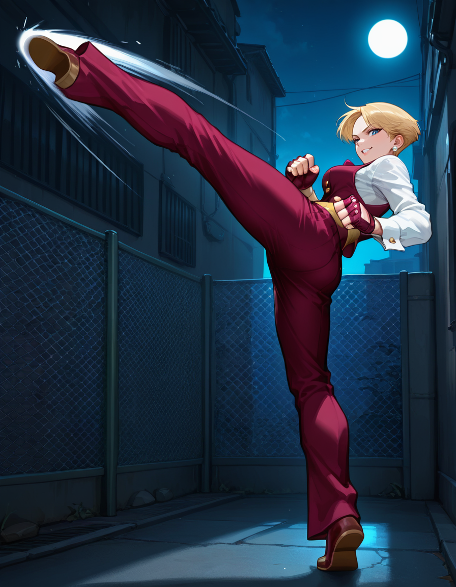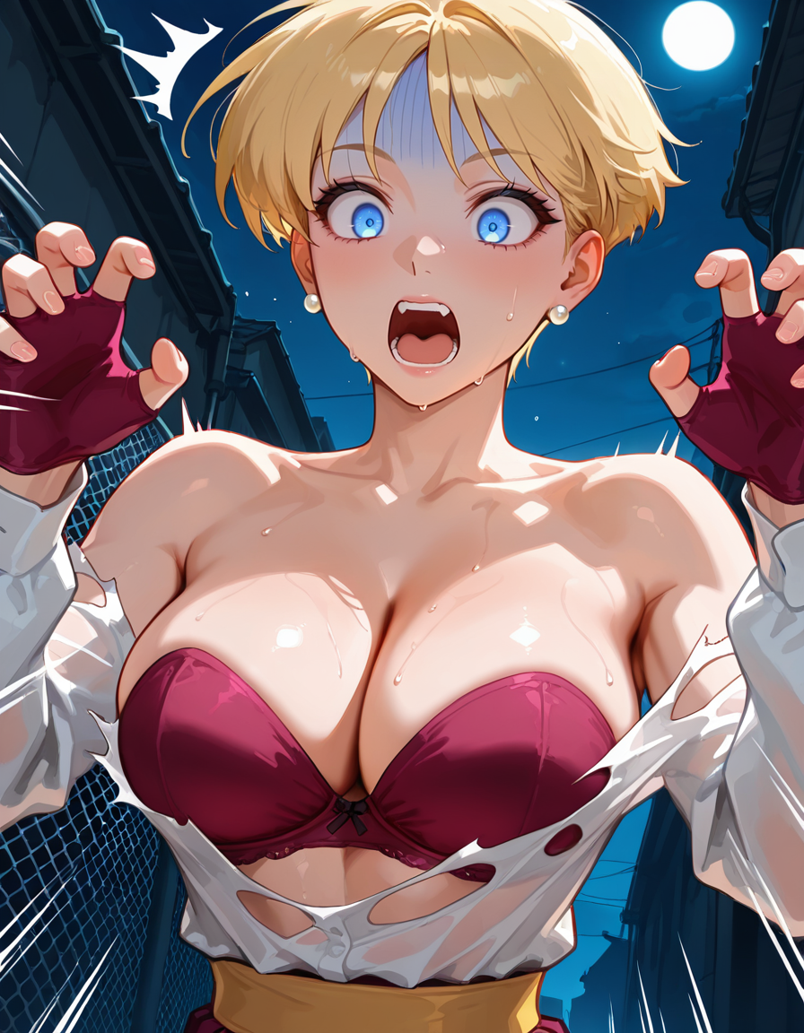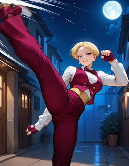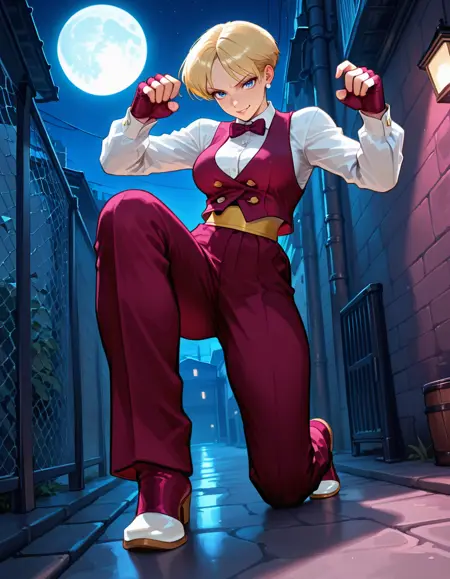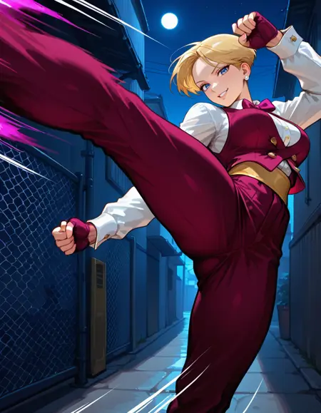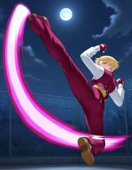 | Trained Words | (cvs_king), (retro artstyle:0.7), (blue eyes, blonde hair, very short hair, pearl ear piercing, large breasts, wide hips, toned female), (king_formal_clothes), (deep pink bowtie, deep pink vest, double-breasted, yellow buttons), (white collared shirt, long sleeves, sleeve cuffs, deep pink fingerless gloves, yellow sash, deep pink pants, deep pink two-tone boots)Copied! (king_blue_energy, flying kick, fighting, jumping, flying, floating, midair, full body:1.5)Copied! (torn clothes, torn shirt, bare shoulders, collarbone, cleavage, pink strapless bra, torn sleeves, torn sash, torn pants:1.5)Copied! |