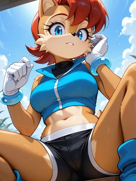 Sally Acorn, Blue Eyes, Red Hair, Brown Fur, Blue Vest, Black Crop Top, Midriff, Blue Bracelets, White gloves, Black Short Shorts, Blue Boots, Short Tail, Chipmunk Tail, Two Toned Fur,