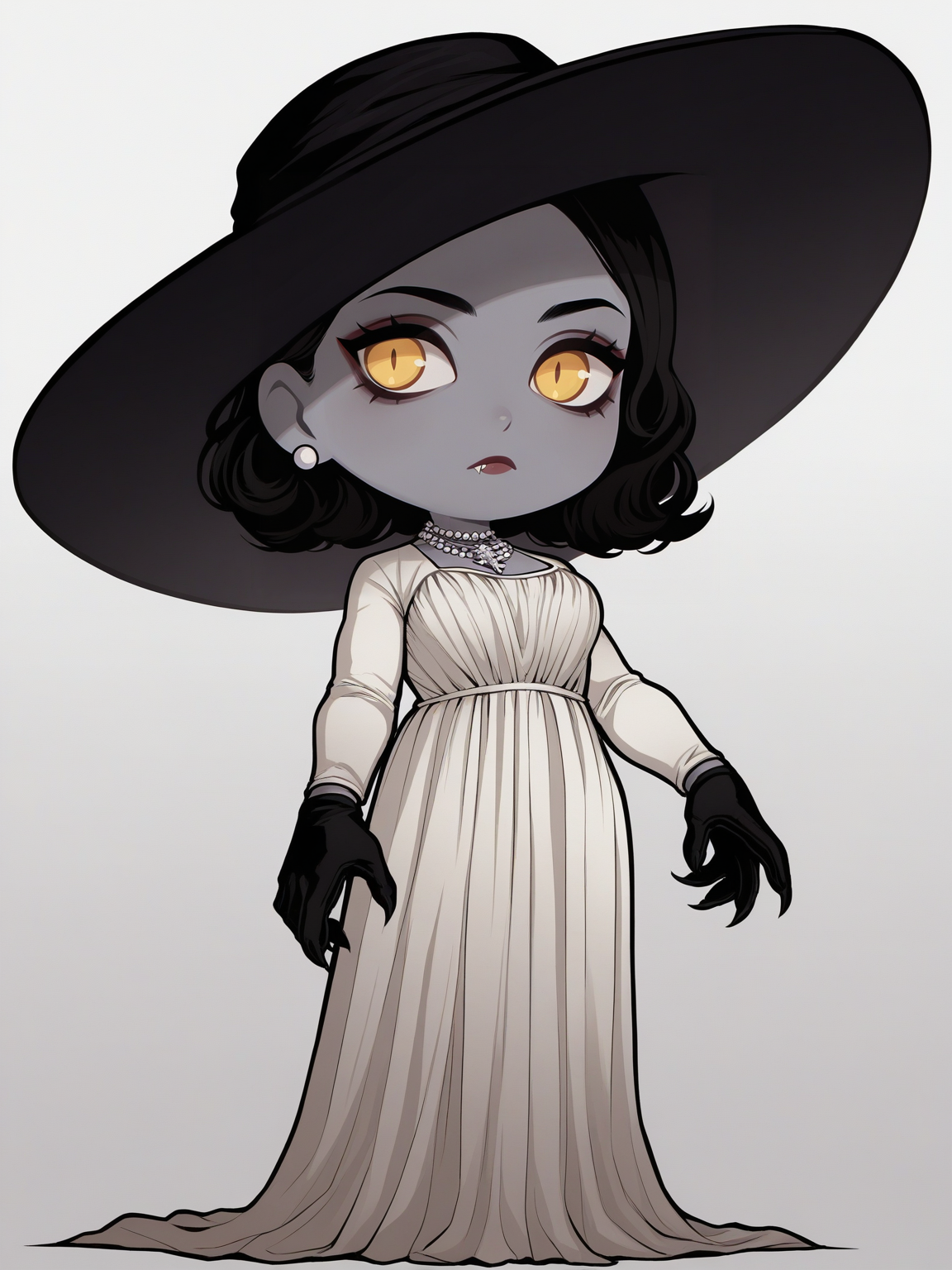 검은 모자, 햇빛 모자, 귀걸이, 진주 목걸이, 흰 드레스, 가슴 노출, 긴 소매, 검은 장갑, 뱀파이어