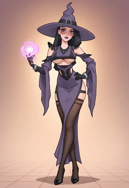 女巫, 帽子, 女巫帽, 紫色头饰, 珠宝, 耳环, 项链, 手镯, 连衣裙, 紫色连衣裙, 衣服剪裁, 下胸围, 下胸围剪裁, 侧开叉, 手套, 肘部手套, 黑色手套, 过膝袜, 黑色过膝袜,