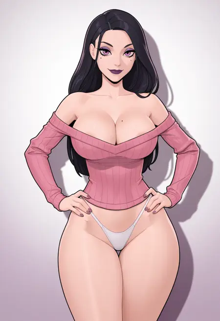 1girl, solo, 紫色眼睛, 黑发, 长发, 乳房, 大乳房, 雀斑, 眼下雀斑, 妆容, 口红, 紫色嘴唇, 紫色眼影,