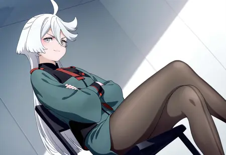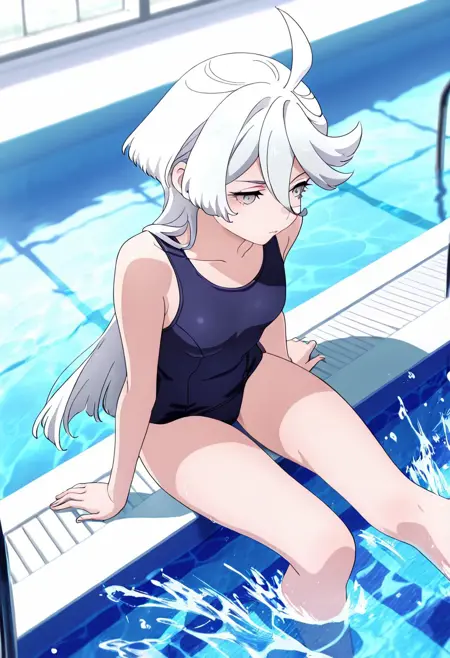 1girl, solo, Miorine Rembran, ahoge, grey eyes, long hair, bangs, white hair, hair between eyes, hair behind ear,