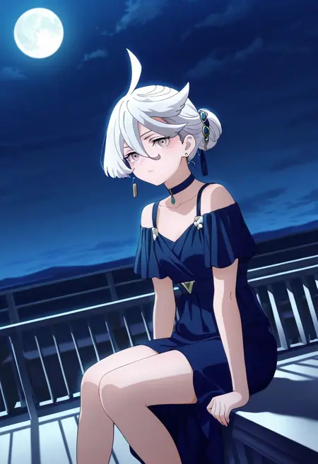 white hair, short hair, hair bun, single hair bun, ahoge, bangs, hair between eyes, hair ornament, jewelry, earrings, choker, collarbone, dress, blue dress