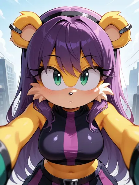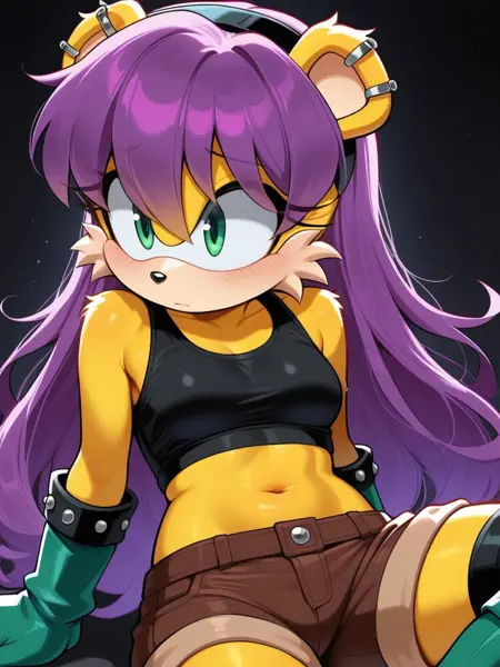 Mina Mongoose, Yellow Fur, Purple Hair, Long Hair, Green Eyes, Ear Piercings, Black Crop Top, Midriff, Brown Shorts, Green Gloves, Green Boots,