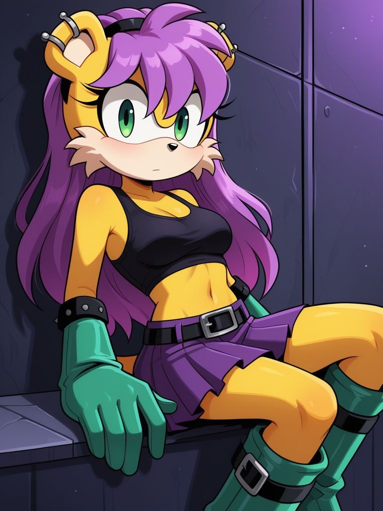 Mina Mongoose, Yellow Fur, Purple Hair, Long Hair, Green Eyes, Ear Piercings, Midriff, Black and Purple Skirt, Black and Purple Crop Top, Green Gloves, Green Boots,