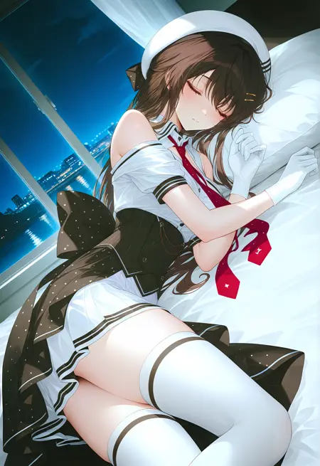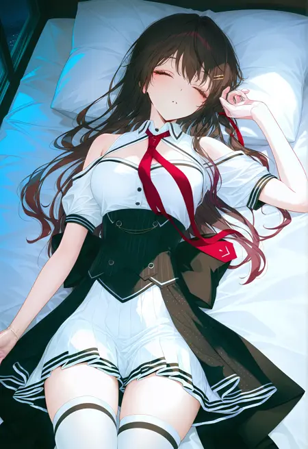 1个女孩,单独,Haruna_Mishima,长发,棕色头发,红眼睛,帽子,贝雷帽,白色帽子,手套,白色手套,领结,红色领结,短披肩,短披肩,颈饰,连衣裙,分层连衣裙,露肩,短袖,黑色紧身胸衣,条纹紧身胸衣,白色连衣裙,短款连衣裙,褶裙,黑色镶边,外裙,裙摆,圆点外裙,黑色外裙,蝴蝶结,大蝴蝶结,背部蝴蝶结,丝袜,及膝长袜,白色及膝长袜,靴子,高跟鞋,白色靴子,红色鞋底,