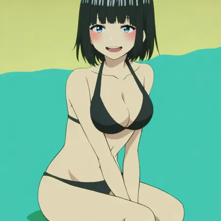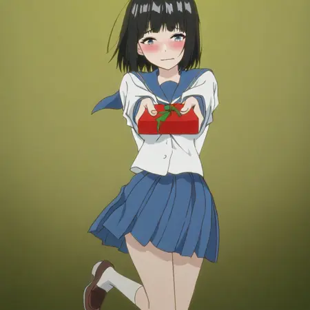 kukumi ureshino \(witch watch\), black hair, medium hair, blue eyes, bangs, school uniform, skirt, neckerchief, socks, heels, large breasts, 1girl, solo