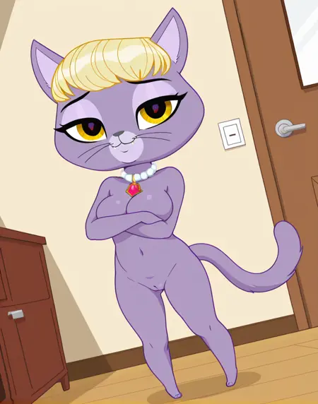 DelilahLPS, cat, furry female, furry, 1girl, purple fur, yellow eyes, blonde hair, bangs, very short hair, fangs, cat whiskers, cat tail, cat ears, gray nose, collar, collar with red gem, semi-anthro