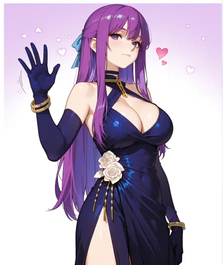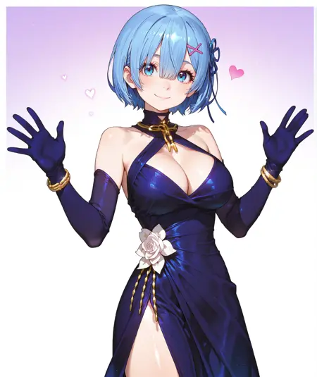 手套、连衣裙、珠宝、花朵、无袖、紫色手套、白玫瑰、吊带裙、金链、晚礼服、断链、蓝色手套、交叉吊带、手镯、链条、白花、蓝色丝带、肘部手套、手链、无袖连衣裙、蓝色连衣裙、玫瑰、吊领、紫色连衣裙、侧开衩、大腿,