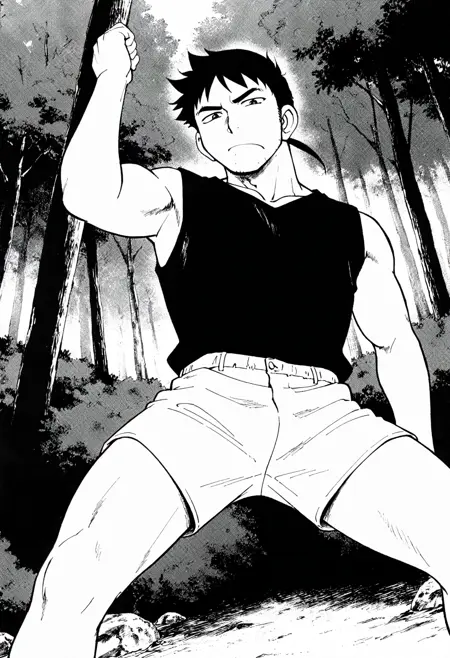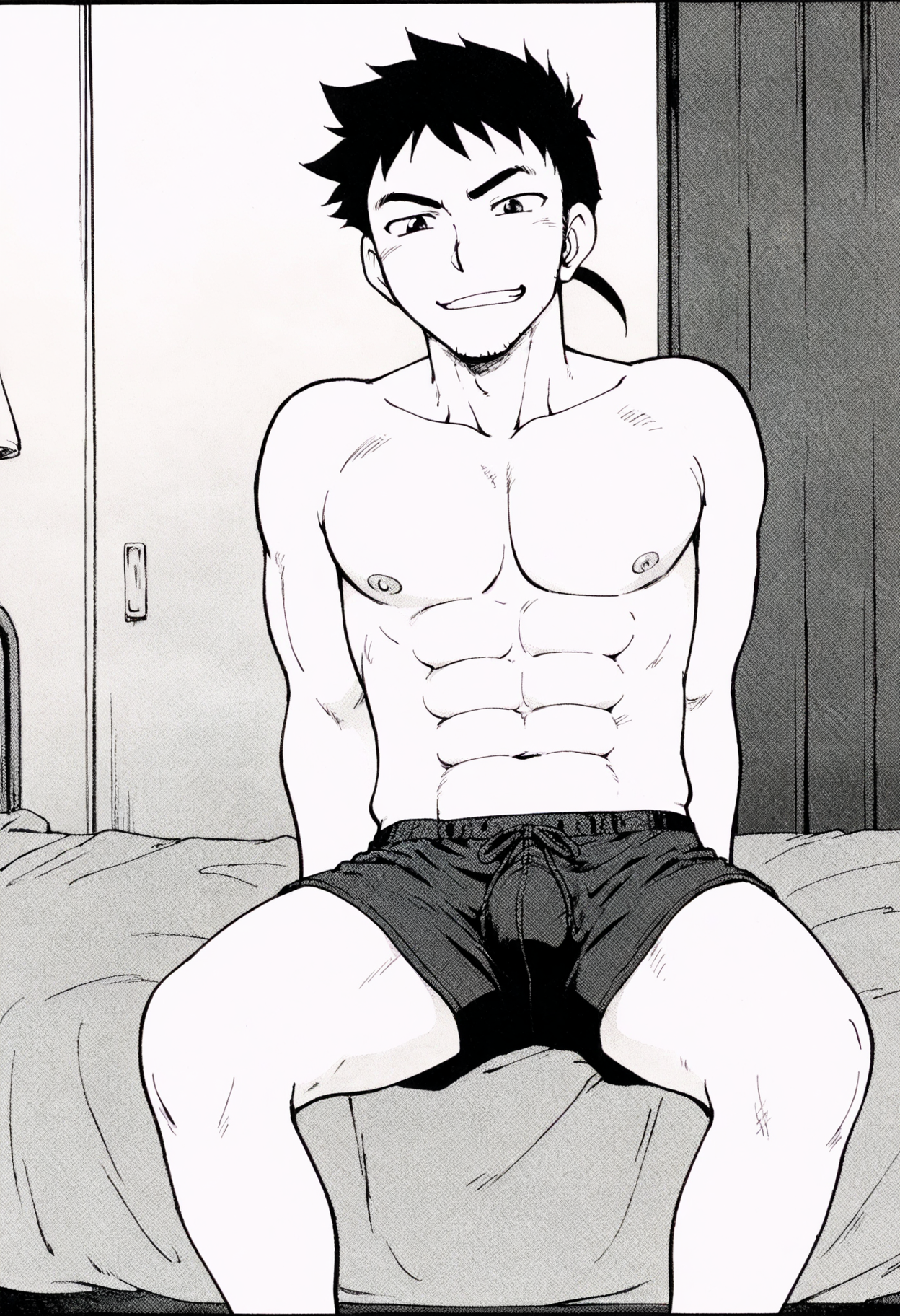 kinkyori_guy 3,((adult)),black hair,low-tied short ponytail,grey eyes,muscular male,facial hair,stubble,uncensored