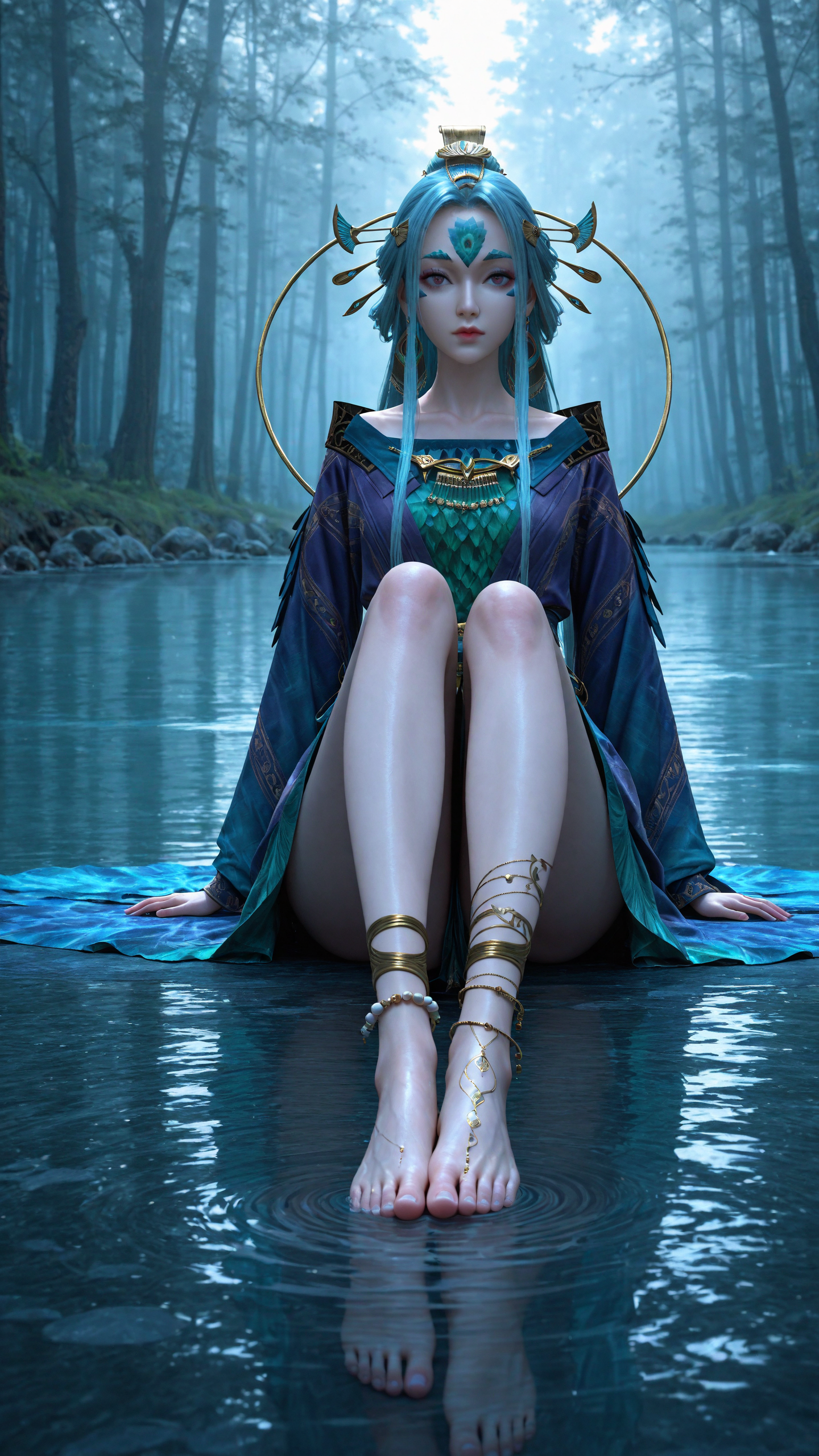封面,1个女孩,独奏,长发,珠宝,发饰,面部标记,额头标记,耳环,妆容,蓝发,看着观众,额头珠宝,赤脚,脚链,脚趾甲,脚,指甲油,脚趾,红眼,发簪,红唇,脚趾甲油,纹身