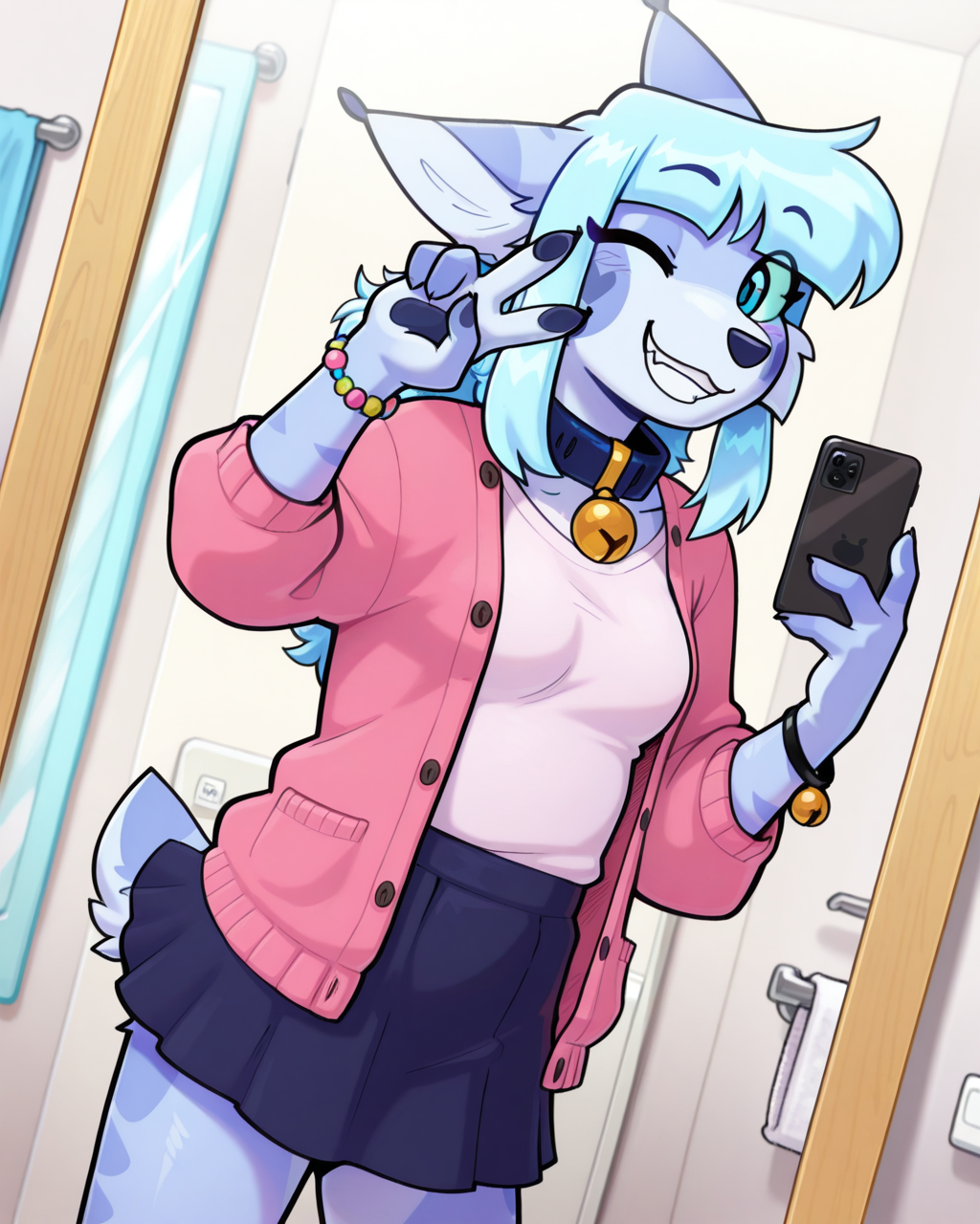 트리거: 스웨터만, 옆머리, 여성, 페리, 파란 눈, 종 모양 목걸이, 파란 머리카락, 검은색 오버사이즈 스웨터, 볼 털, 어깨 드리핑 스웨터, 꼬리, 귀여운 송곳니, 중간 크기 가슴, 브라 끈