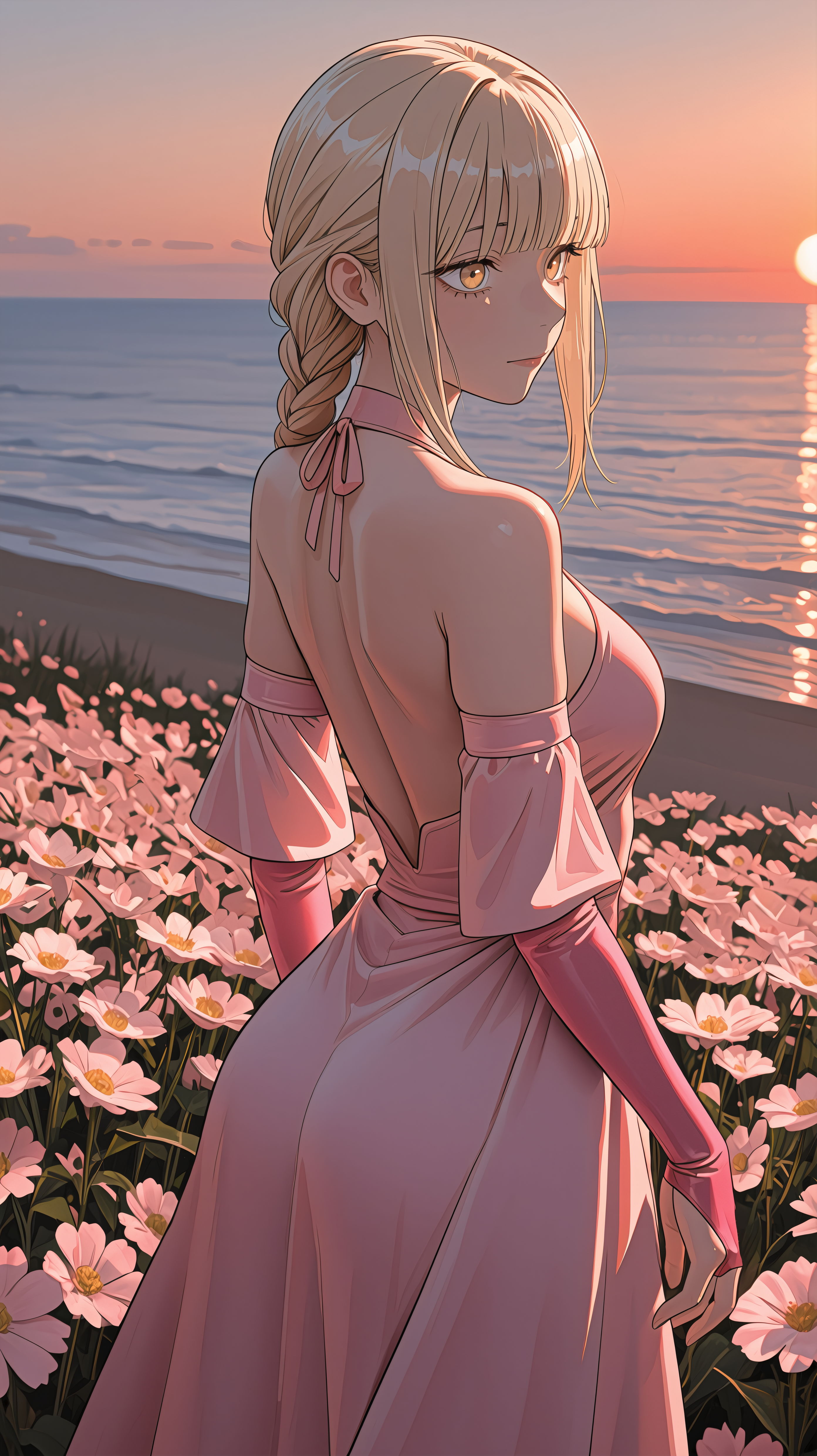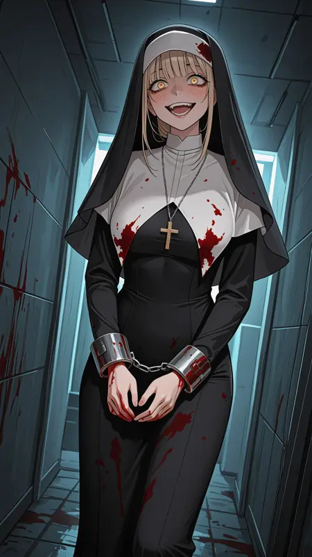 mira_mdud, blonde hair, sidelocks, blunt bangs, desaturated yellow eyes, nun outfit, nun headdress, cross necklace,