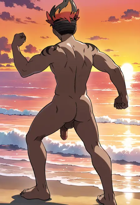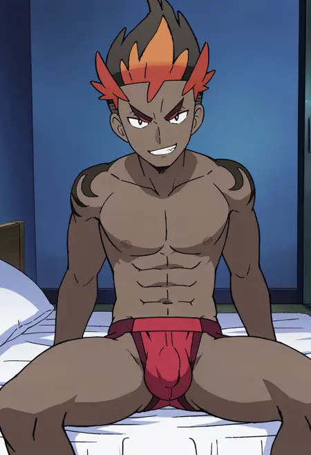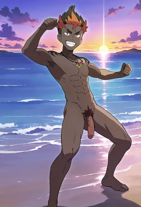kiawe,two_tone hair,black hair,red hair,black eyes,muscular male,dark skin,dark-skinned male,shoulder tattoos