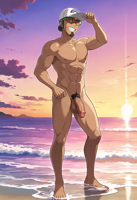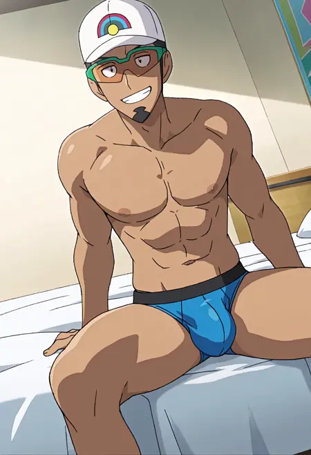 ,kukui,buzz cut,black hair,black eyes,man bun,facial hair,goatee,sunglasses,white baseball cap,muscular male,dark skin,dark-skinned male