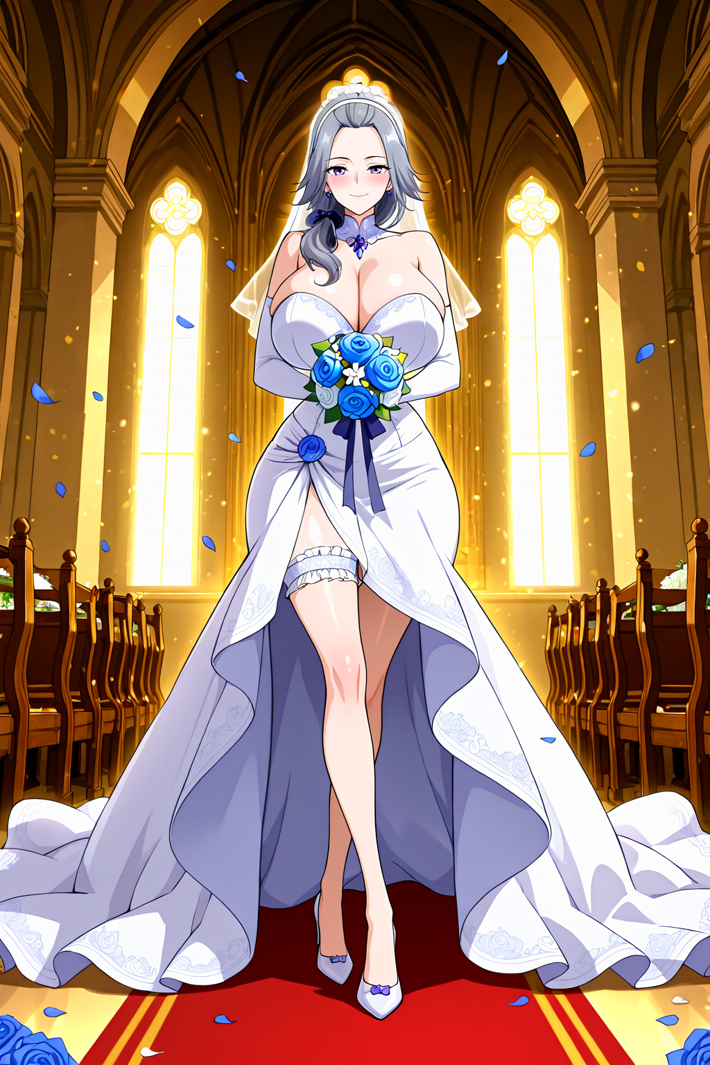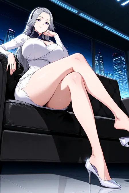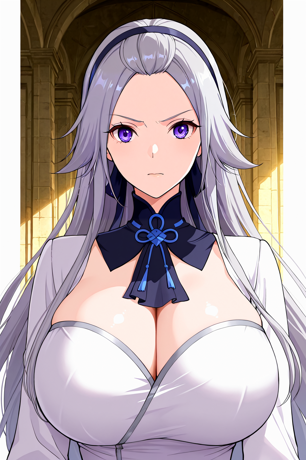 hanyue, purple eyes, long hair, grey hair, hairband, forehead