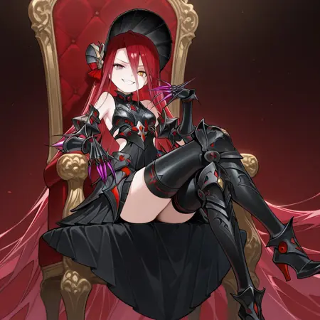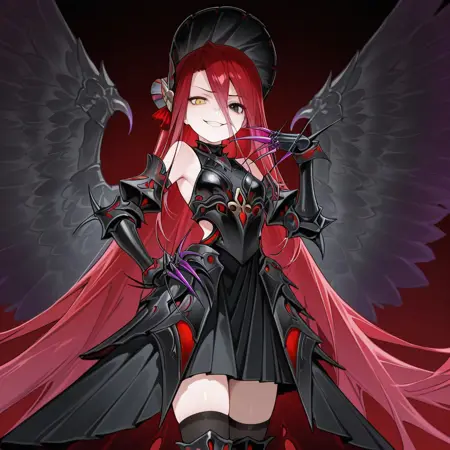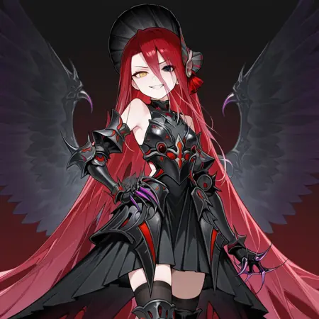 Outfit 1: 1girl, very long hair, red hair, hair between eyes, heterochromia, yellow eye, black eye, small breasts, Bonnet Hat, black dress, armored top, torso cutout, detached sleeves, armored gloves, purple claws, long claws, armored spikes on skirt, pleated skirt, red accents, black thigh highs, armored boots, red claws on shoes, pointy heels,