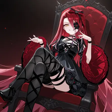 Outfit 2: 1girl, very long hair, red hair, hair between eyes, hair bow, braid, yellow eye, small breasts, purple black nail polish, black head ribbon, floral ribbon, ribbon covering one eye, red choker, black dress, black breast straps, puffy sleeves, wide sleeves, frilled sleeves, red frills, slit sleeves, black wrist band, lace trimmed dress, crisscross legwear, red ancle band, black highheels,