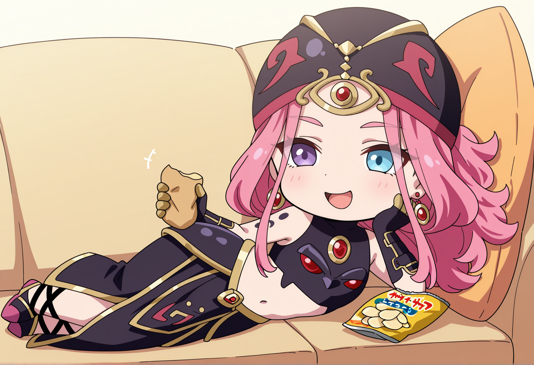 Normal costume: pink hair, long hair, heterochromia, purple eyes, blue eyes, earrings, helmet, armor, sleeveless, chest jewel, body markings, gauntlets, navel, armored skirt